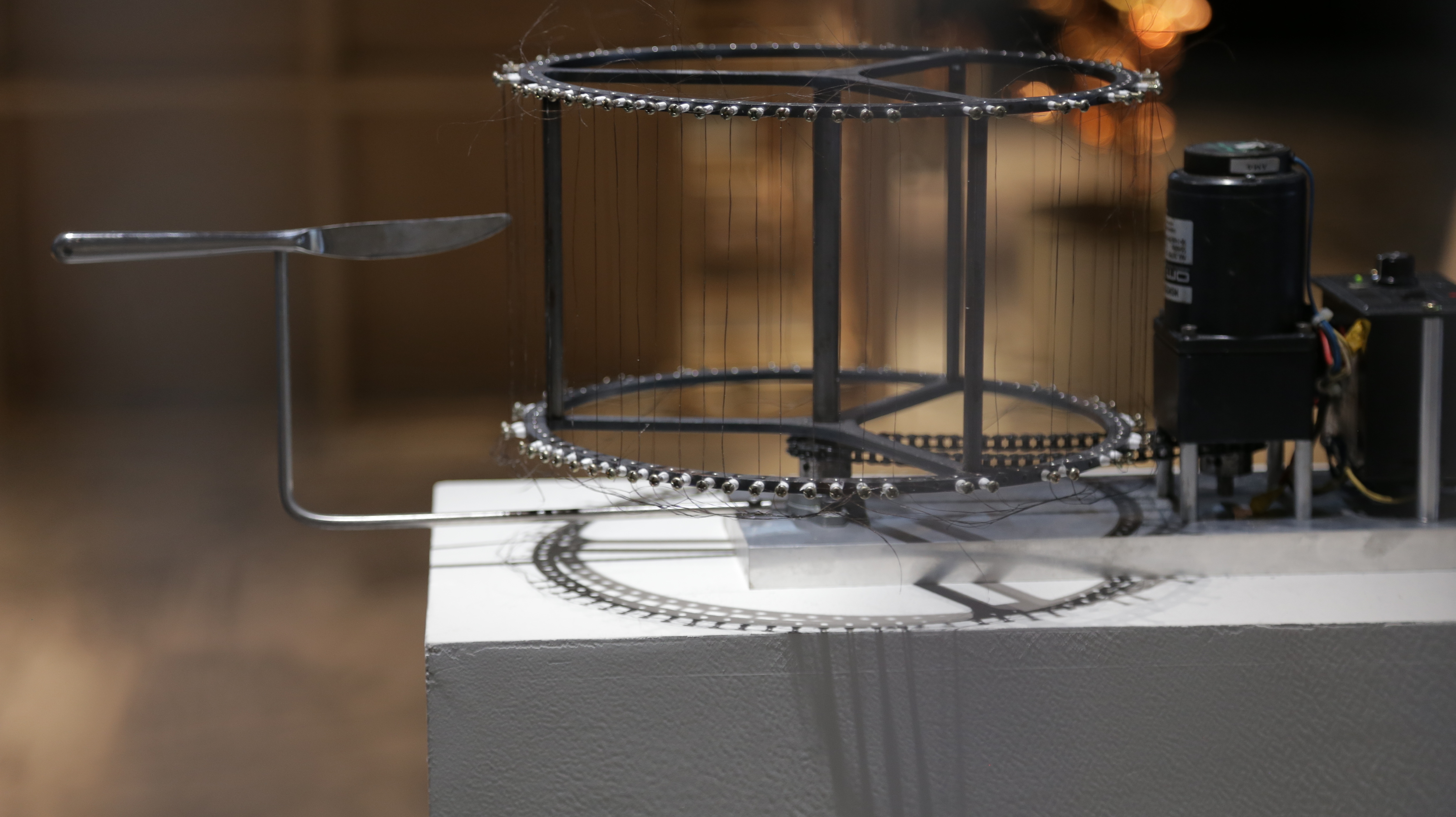 An instrument made with my hair. Each strand is a relative scale and one full spin plays the Taiwanese national anthem via the knife as pick. With time all the strands break. A performance piece that silences upon completion.