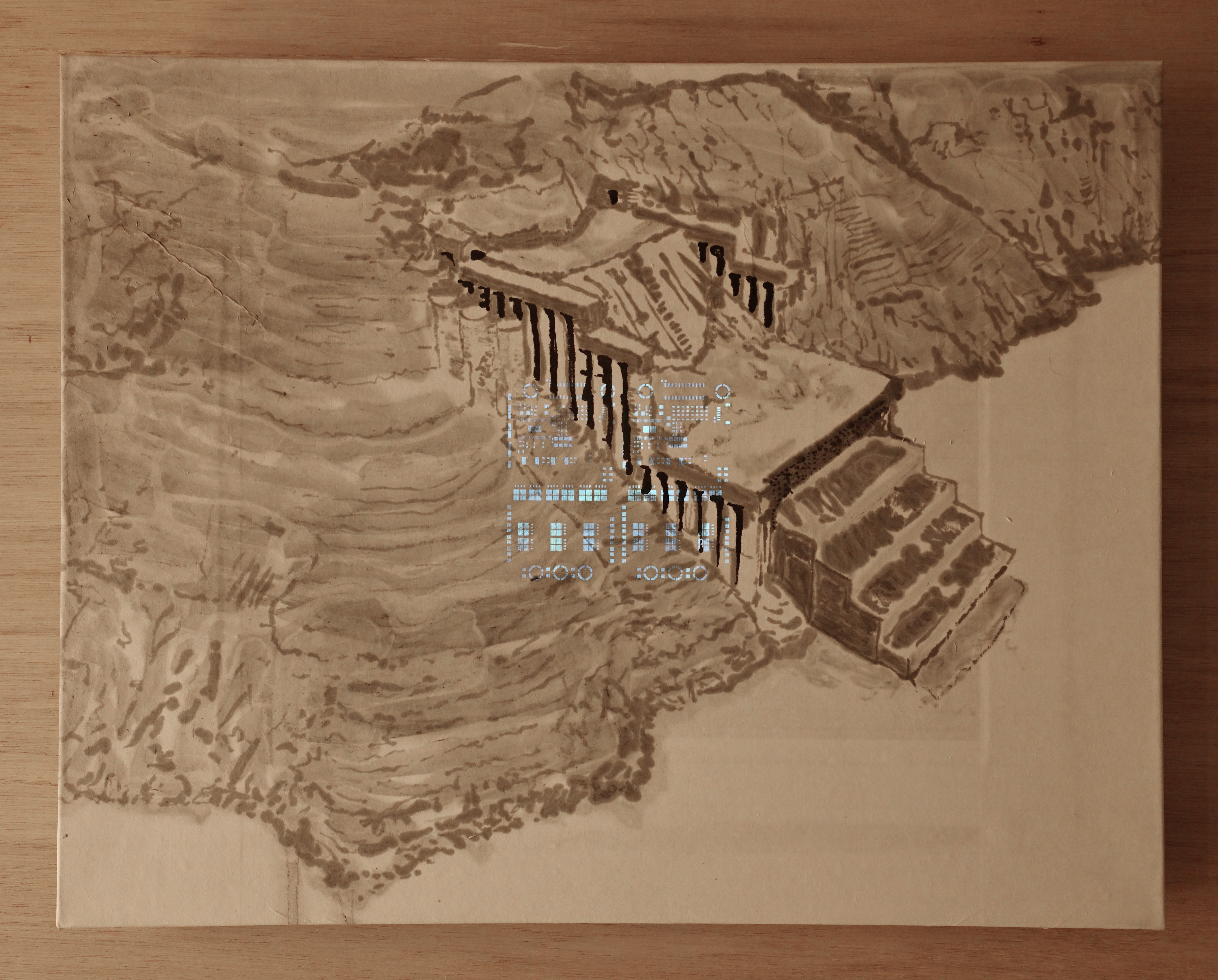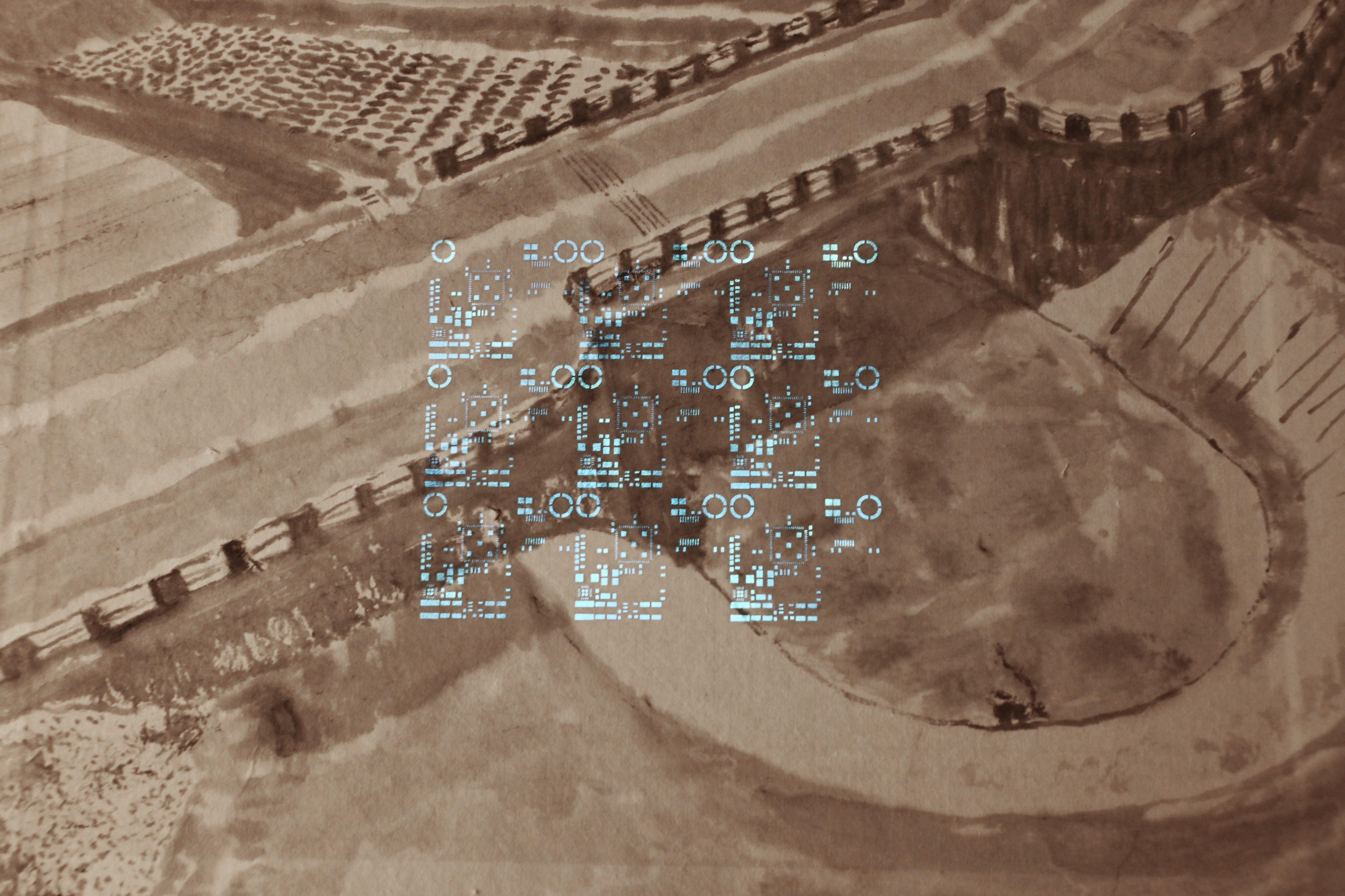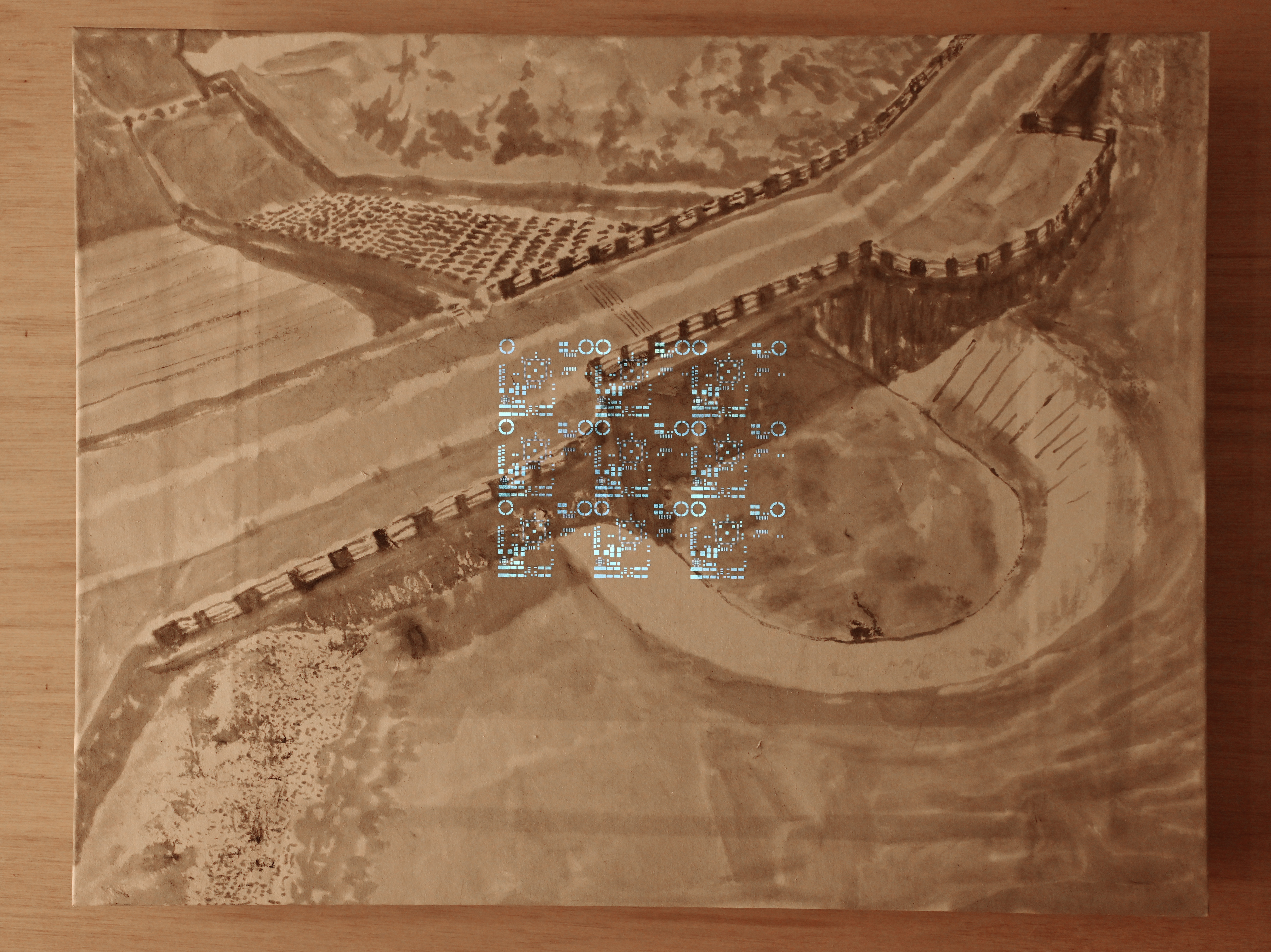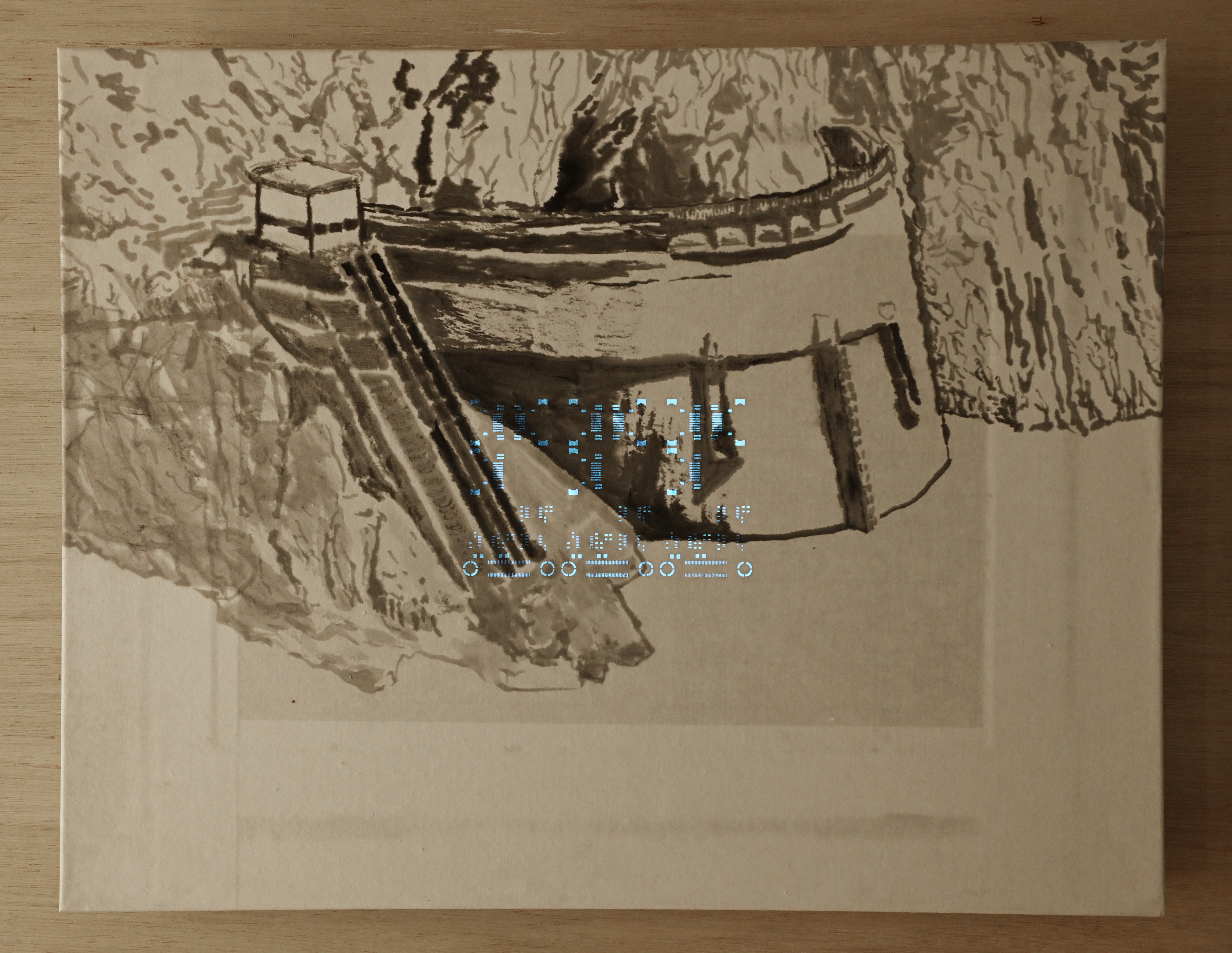 Each image sits on an SMT aluminum frame, the stencil normally used to print solder paste for PCB production. The valley, the dam, the terraced field are laid over a tool designed for routing currents across a board. Hydraulic earthworks rest on the negative of an electronic circuit. Behind the frame, a video of water plays very quietly, its light and shadow slipping through the stencil. The animation is almost imperceptible, like breath. The wetness and the intelligence is not only in the motif of reservoirs and spillways, but in this slow, regulated shimmer of water behind the mask.