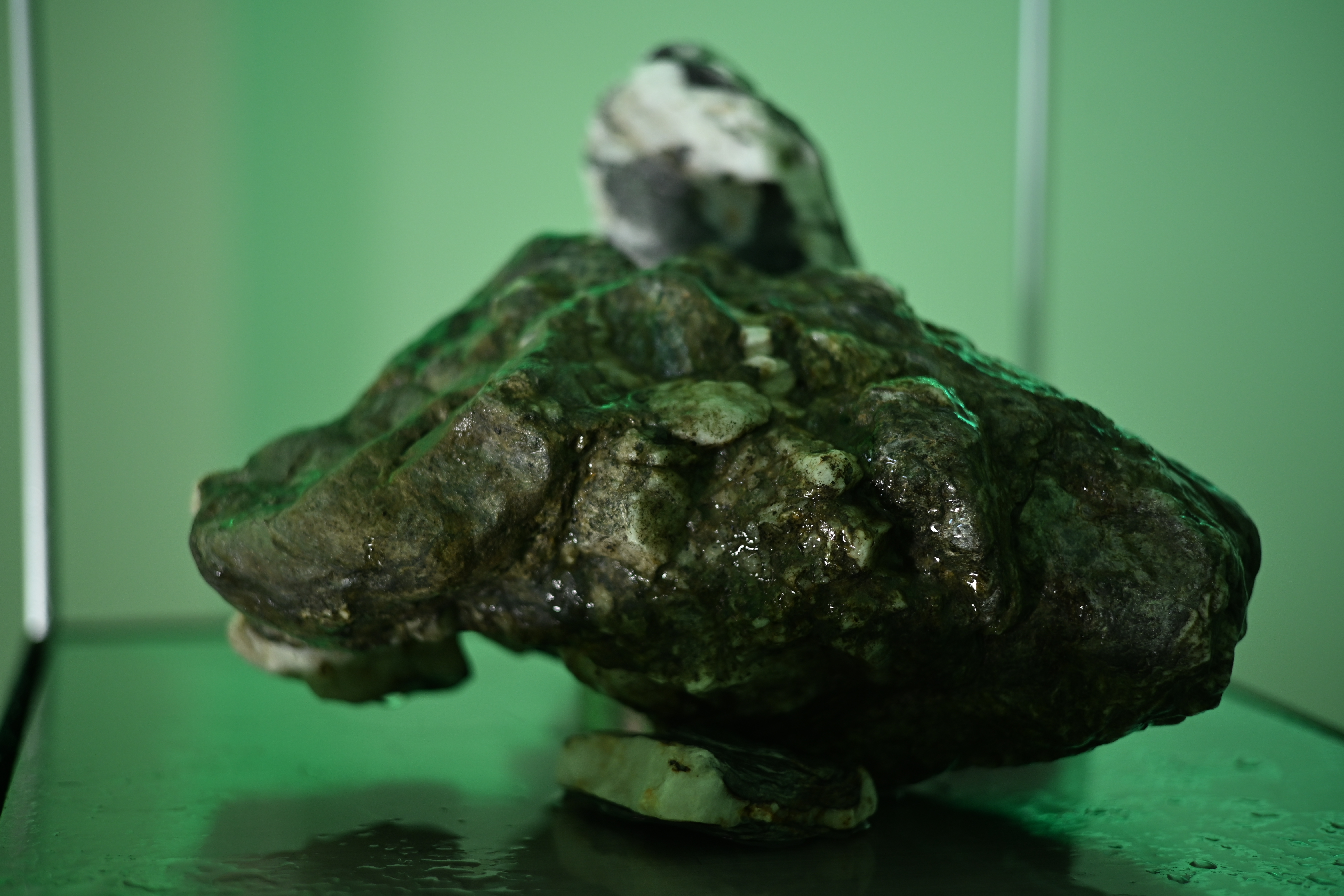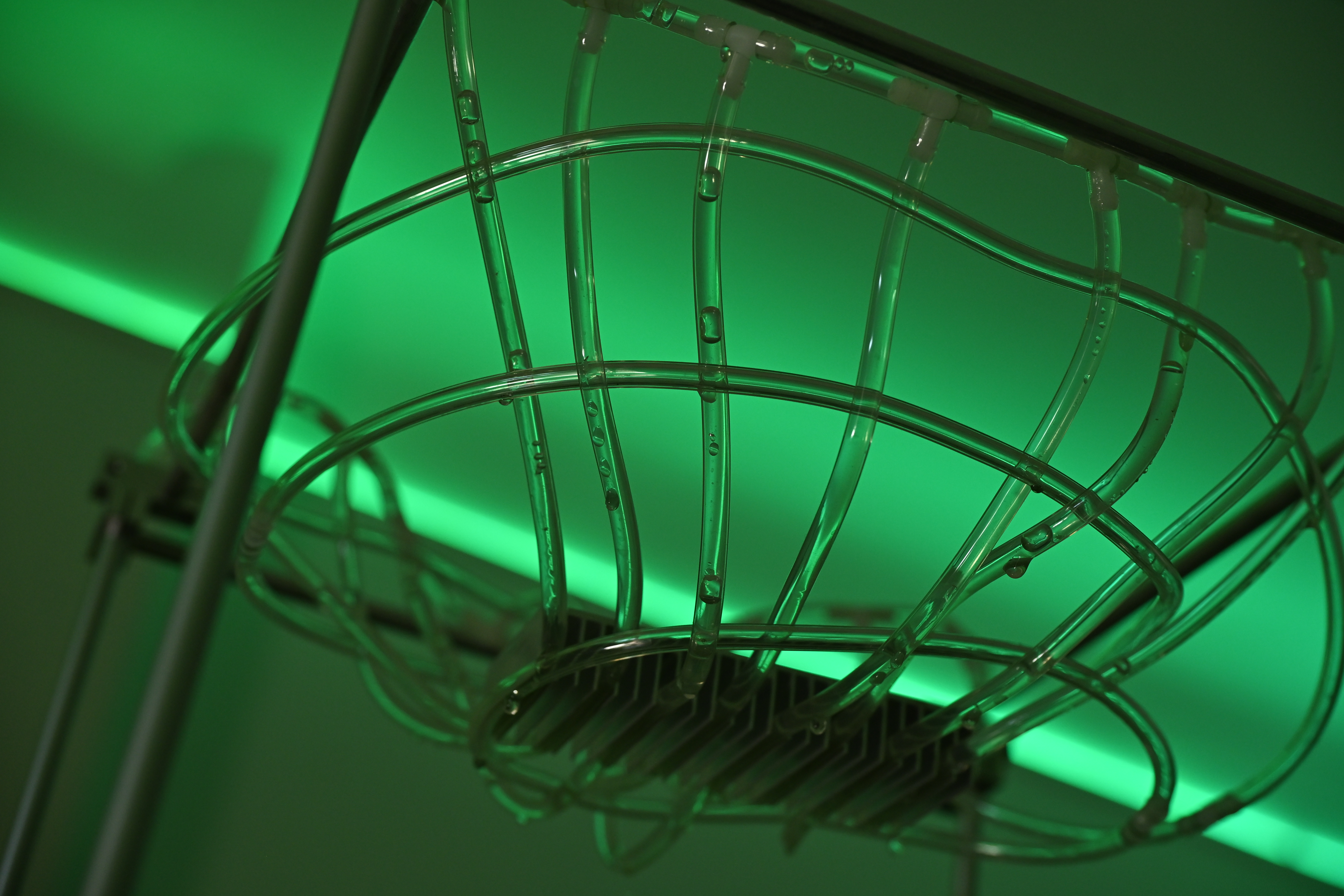 The fountain centralized in the space, is a continuous stream of water, which weaves and drips with similar technology to the ancient craft of tapestry, displayed at the entrance to the space. The serpentine and quartz at its center points to the mineral extractivism embedded in the infrastructures of AI, from silicon wafers to rare earth materials. The water’s flow rate directly responds to real-time waves of volatility in NVIDIA’s stock price. This occurs through the operation of a microcontroller inherent to the clay plinth, which ties the flow of water to today’s markets and the corporations that stand for its dominance in the global AI thirst. Sometimes the water will flow rapidly, at other times quietly in direct response to the volatility of global financial markets, responding to socio-political change and the polycrisis.